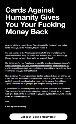 Viking_Hippie@lemmy.dbzer0.com to 196@lemmy.blahaj.zoneEnglish · 8 hours agoCAH Gives You Your Fucking Money Back...rulelemmy.worldimagemessage-square15linkfedilinkarrow-up1346arrow-down10file-text